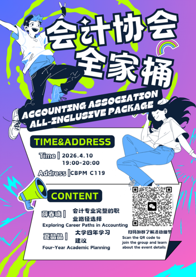 本次活动,会计协会将邀请马允教授带来商科知识分享。不仅如此,为助力会计专业 学子清晰规划学业与职业发展路径,本次活动聚焦升学申请核心要素与就业秋招实战 技巧,邀请飞跃手册丁以恒学长和目前大三在读学姐秦远东,从“软背景提升,裱花准 备,留学就业抉择,秋招面试通关”等维度,全方位拆解会计专业升学与就业的关键节 点,为同学们提供可落地的经验参考与资源指引。